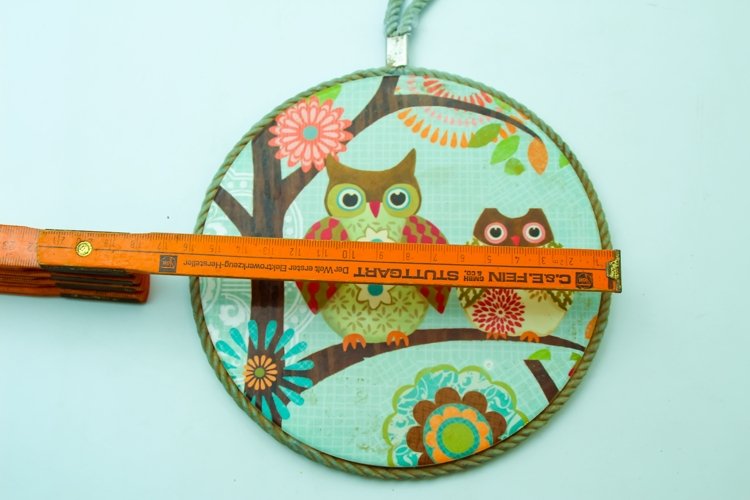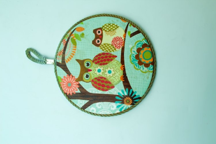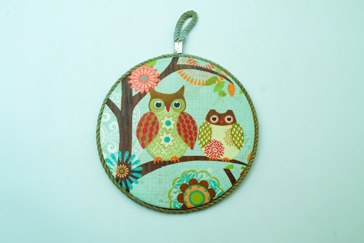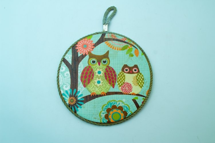 אריח עגול ומקסים עשוי קרמיקה בסגנון קורק טריבט אירי, עם ציור שני ינשופים על עץ, עם חוט תלייה לקיר.