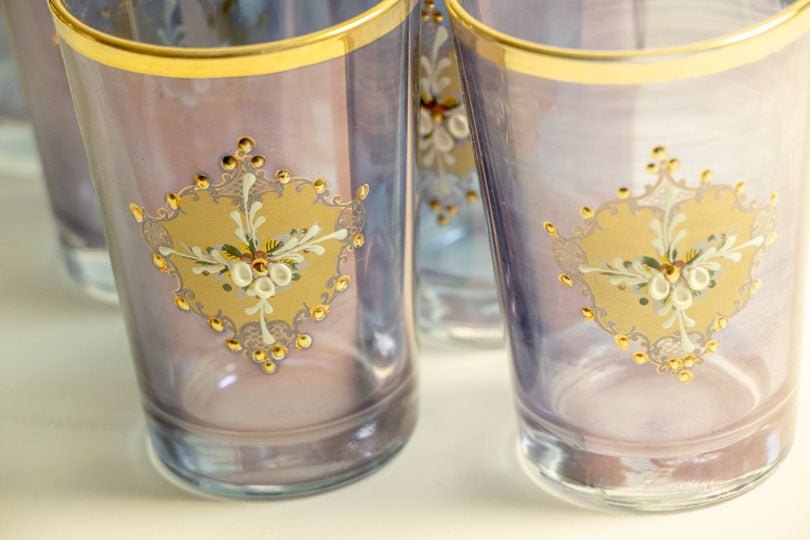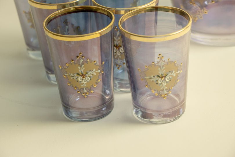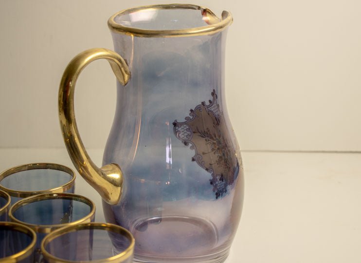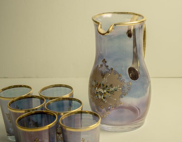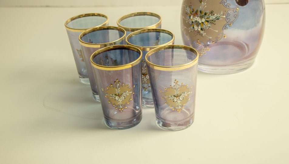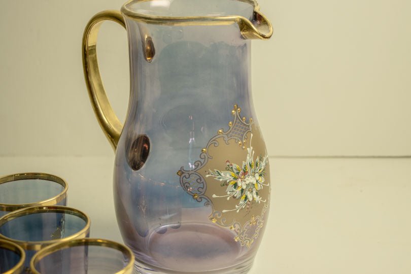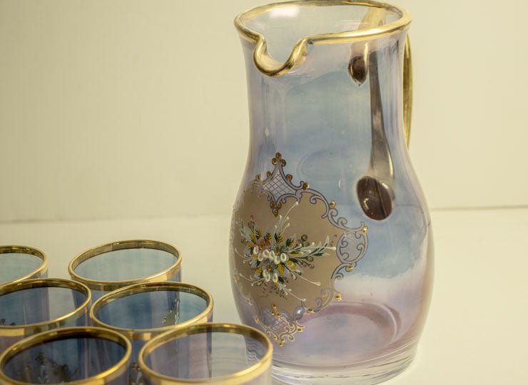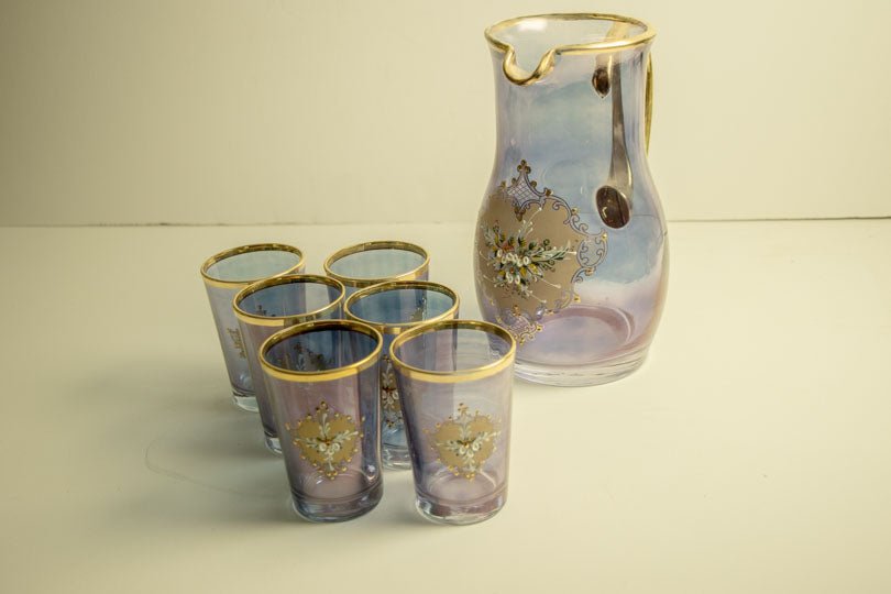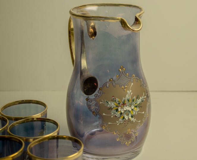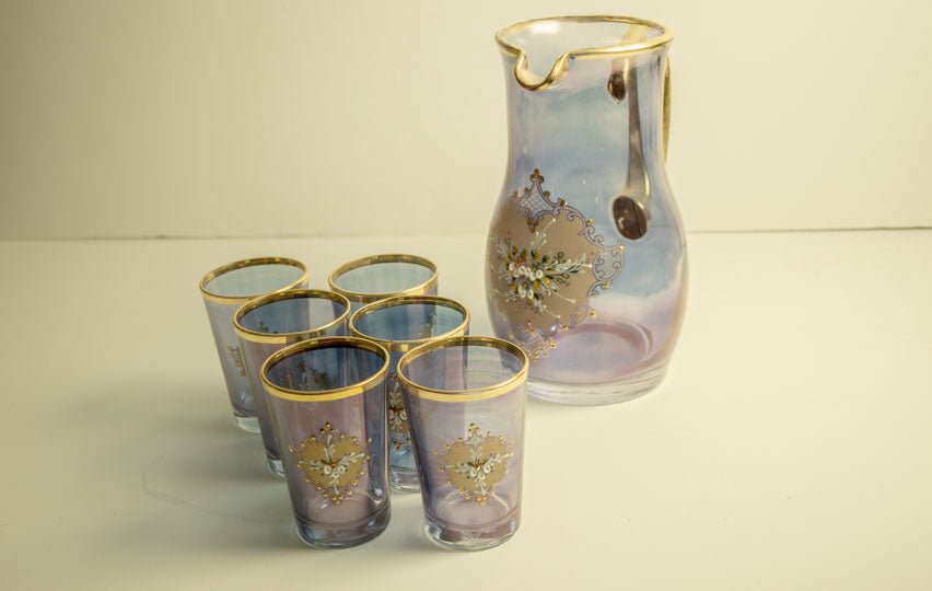 סט של שש כוסות וקנקן מושלמים בגוון סגול בעיטורי אמייל מעוטרים בפרחים בצבע זהב ולבן מסוף המאה ה-19.