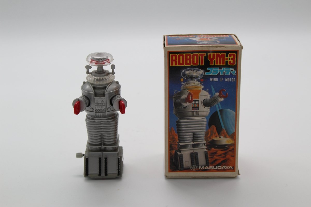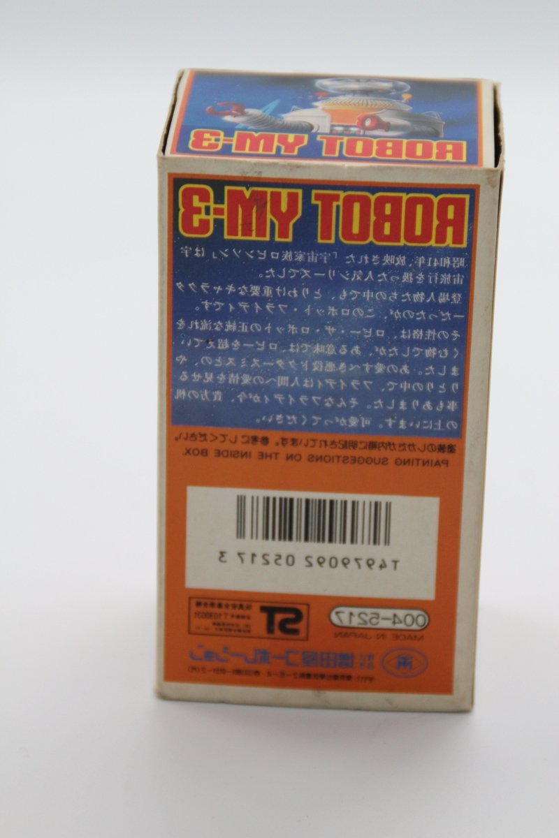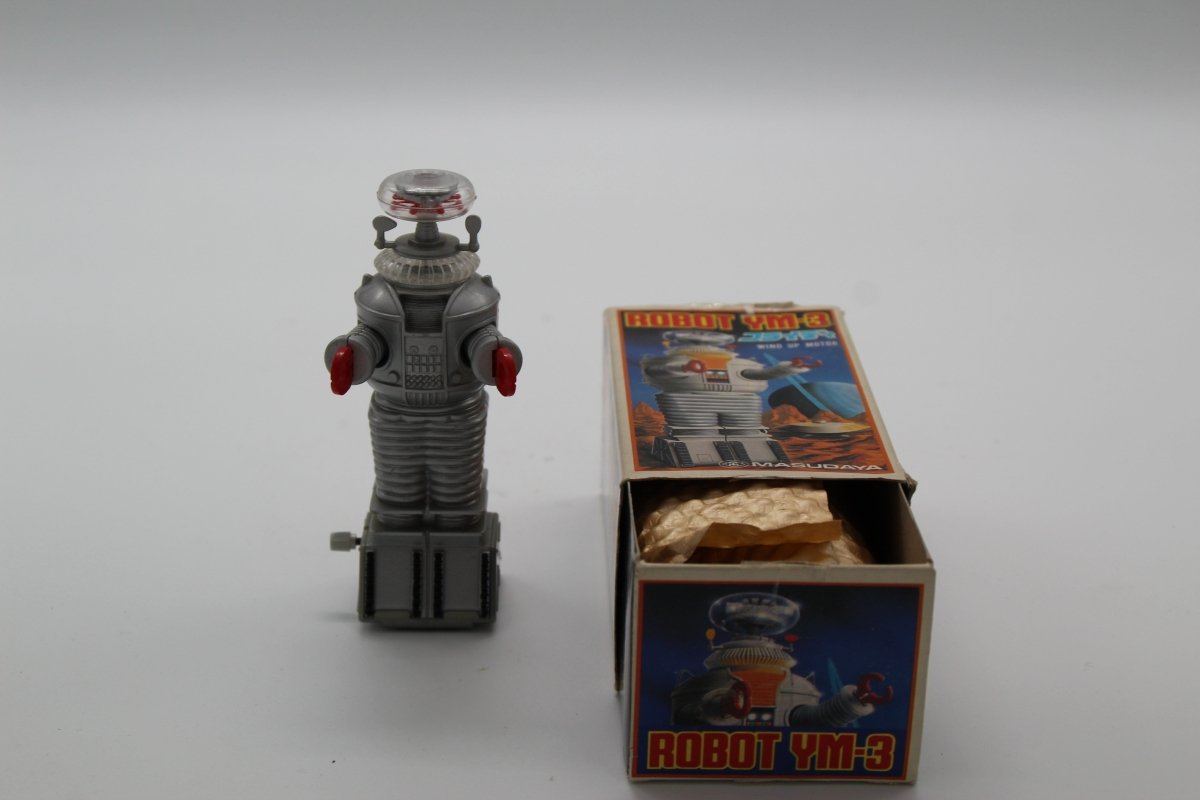 רובוט YM3 מאבודים בחלל- צעצוע רובוט קפיץ מכני מפח, פריט וינטג' נדיר שיוצר בשנת 1985 על ידי חברת Masudaya שמור כחדש באריזה