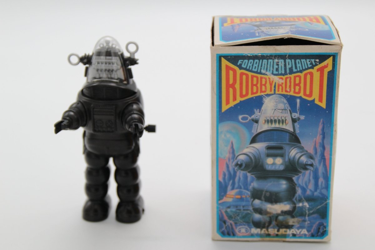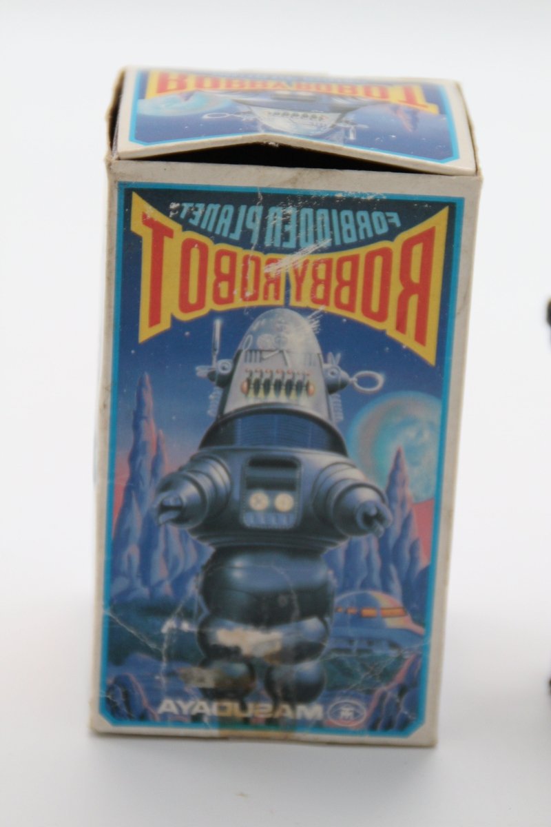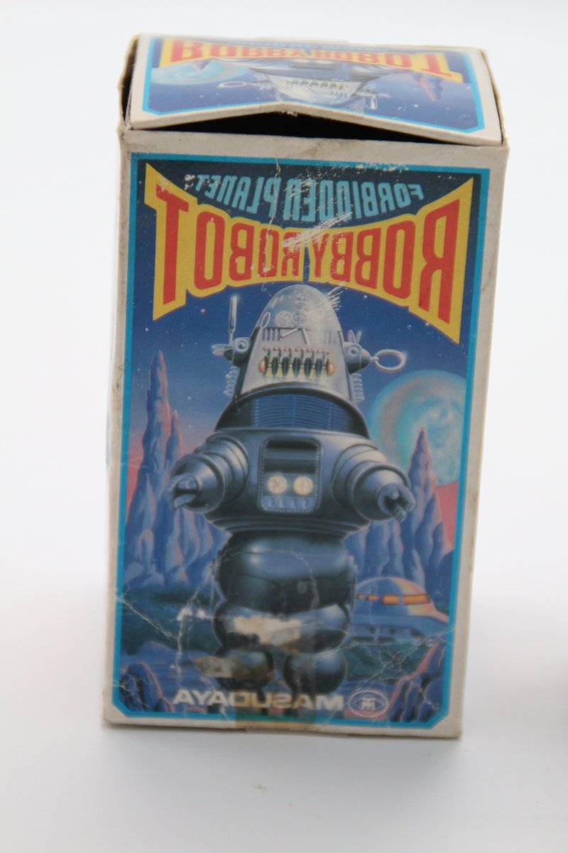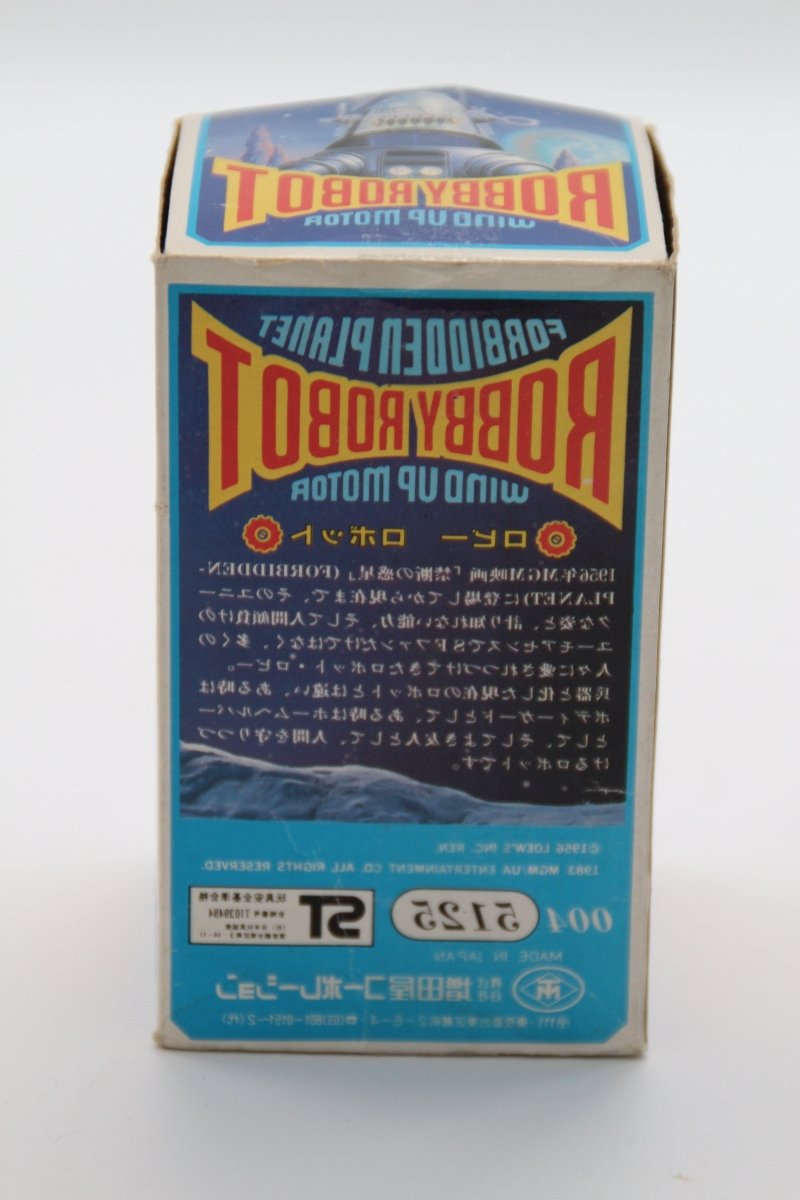 רובי הרובוט מהכוכב האסור - צעצוע רובוט קפיץ מכני מפח, פריט וינטג' נדיר שיוצר בשנת 1984 על ידי חברת Masudaya שמור כחדש באריזה